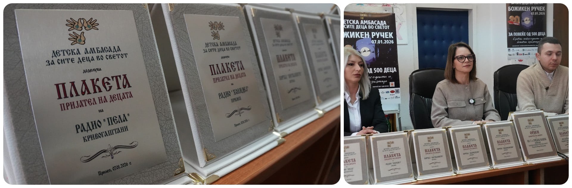И оваа година, покрај добитникот на Орденот за носител на мирот, ќе се доделат и ПЛАКЕТА ЗА ПРИЈАТЕЛ НА ДЕЦАТА, за кои Детската Амбасада за Сите Деца во Светот одлучи да ги додели на: ЈП Македонска Радио Телевизија, Канал 5 Телевизија, Наша Тв Телевизија, Телевизија Тера, Радио Пела, Радио Холидеј и порталите Инфокомпас, Маркукуле и Шеталиште, медиумски покровители на Божикниот ручек во сите овие изминати 20 години.