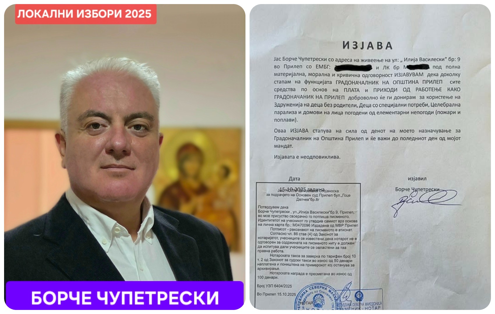 Борче Чупетрески, независниот кандидат за градоначалник на Општина Прилеп доброволно ќе ги донира платата и приходите по таа основа. Според изјавата потпишана и заверена на нотар Чупетрески средствата ќе ги донирал за користење на Здруженија на деца без родители, на деца со посебни потреби, на здруженија за церебрална парализа и за семејства чии што домови биле погодени од елементарни непогоди.