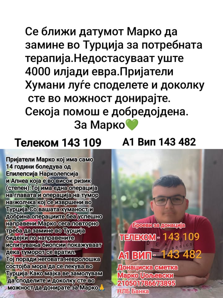 Семејството на Марко апелира до сите добри луѓе кои се во можност да помогнат со донации, за да се обезбедат средствата потребни за повторно лекување на Марко во Турција. Сумата што треба да се собере е 4000 евра…