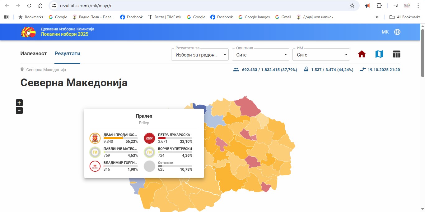 Дејан Проданоски од ВМРО ДПМНЕ со 10.920 гласови води со убедлива поведа пред, Петра Лукароска Коалиција за локални изобри 2025 од СДСМ 3969 гласови. Владимир Ѓорѓиоски од Македонска ЕРА има 354 гласа ,Демократи со Јсмина Стојчевска 147 гласа , Либерално-демократската партија и Жарко Бошкоски 273 . Од независните кандидати за градоначалници, Павлинче Матевска,според првичните неофицијални резултати на ДИК има 950, Борче Чупетрески 862, Љупчо Дунимаглоски 201, а Ѓорѓија Игески 126.