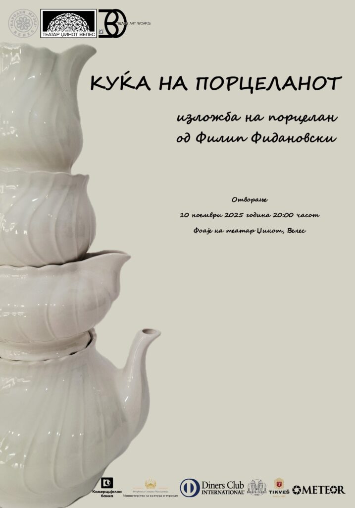 Изложба на порцелан насловена „Куќа на порцеланот“ на Филип Фидановски ќе биде отворена на 10 ноември во 20 часот во фоаје на НУ Театар „Јордан Хаџи Константинов-Џинот“ – Велес. На изложбата ќе бидат претставени скулптури и инсталации во простор. За изложбата во каталогот кураторот Јасминка Намичева ќе напише: -Во контекст на современата македонска уметничка сцена, „Куќата […]