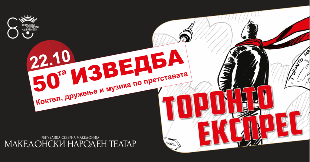 На 22 октомври, во 20 часот, на малата сцена во Македонскиот народен театар ќе биде одиграна јубилејна 50-тата изведба на монодрамата „Торонто експрес“, работена според мотивите на збирката есеи „Тибам Штркот“ од Зоран Спасов–Ѕоф и во режија на Јордан Симонов. Во претставата игра Александар Микиќ. По изведбата е предвиден коктел за публиката, заедно со екипата од претставата, музика и дружење. „Торонто експрес“ е агенција за помош при емиграција […]