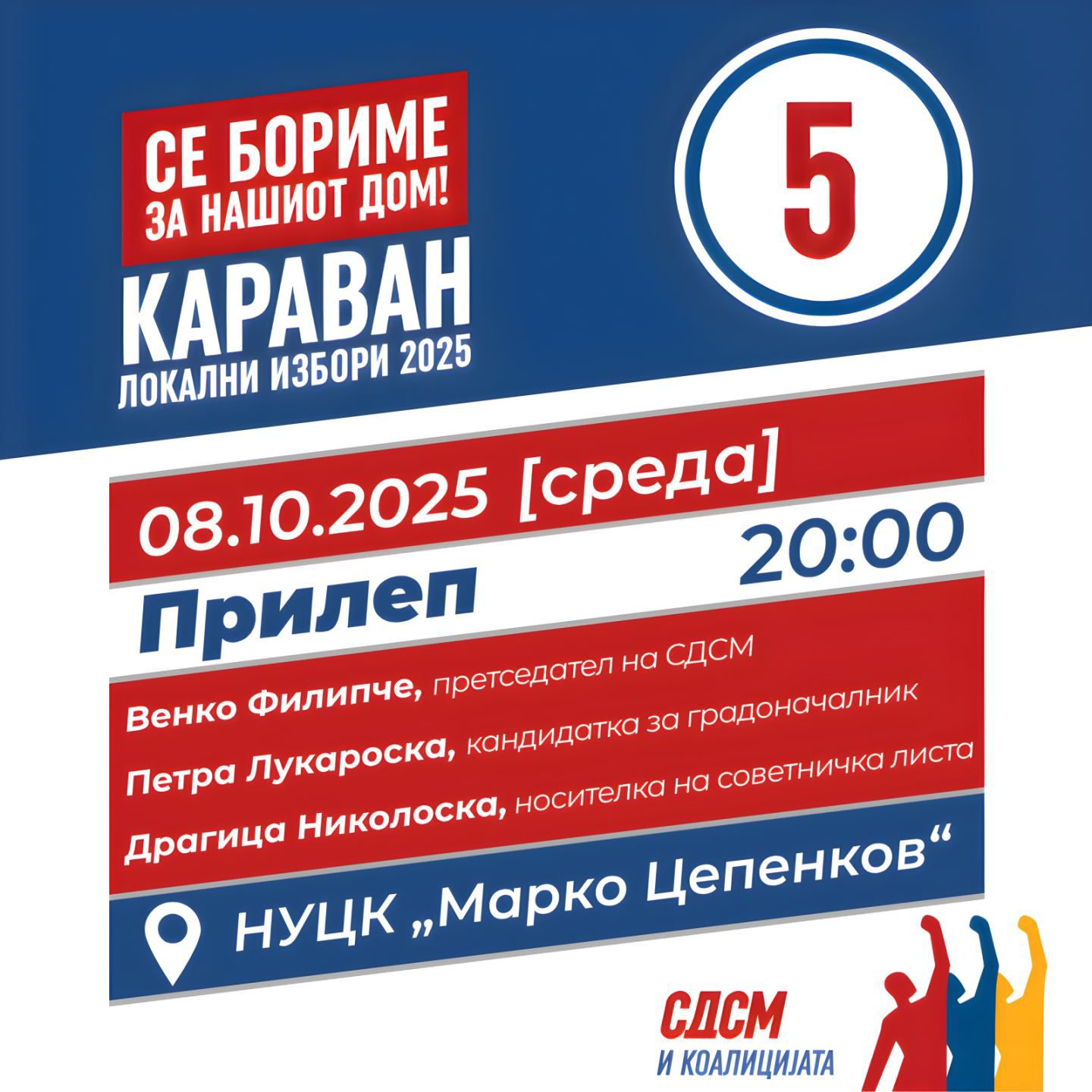 Караванот, Локални Избори 2025  на  СДСМ и Коалицијата , под наслов „Се бориме за Вашиот дом“ утре (08.10 2025) среда ќе биде во Прилеп.