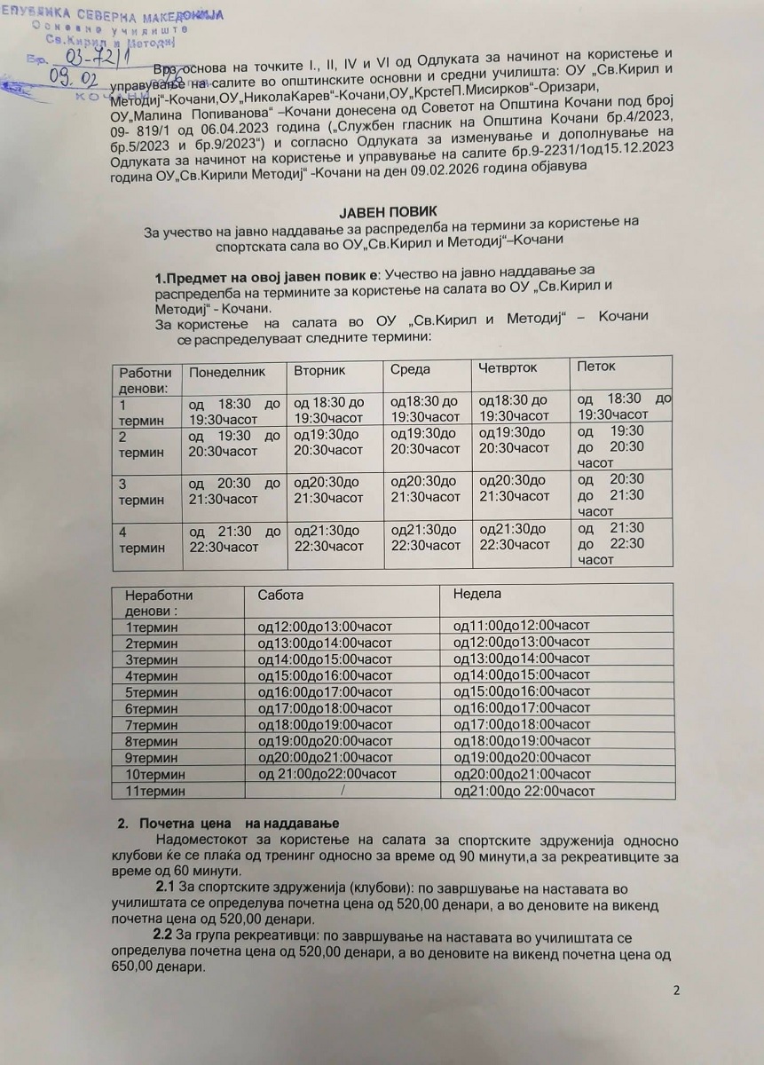 Јавен повик за наддавање термини за користење на спортската сала во ОУ „Св. Кирил и Методиј“ – Кочани