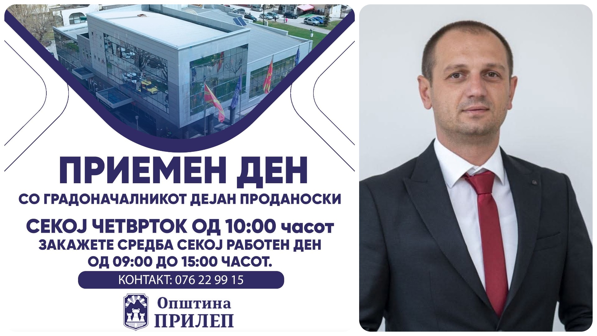 Градоначалникот на Општина Прилеп, Дејан Проданоски, најави нова иницијатива за директна комуникација со граѓаните преку редовни, отворени средби што ќе се одржуваат секој четврток од 10:00 часот во просториите на општината.