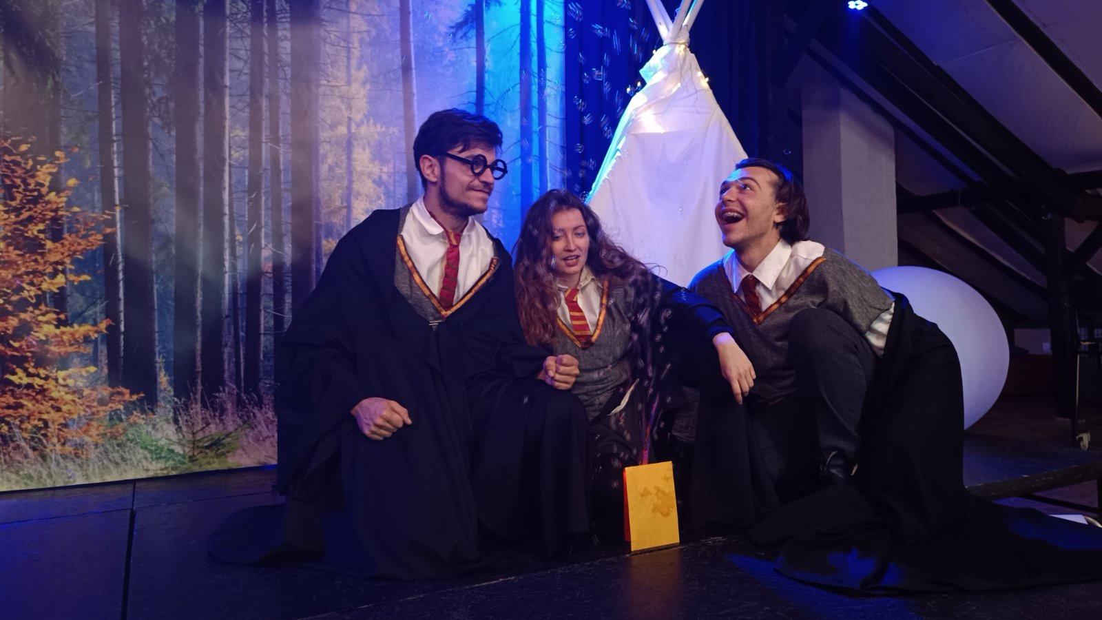 Во претстваата играат: Хари- Бобан Алексоски-Хермиона, Валдена- Надица Петрова Визли, Гринимор- Бранко Михајлоски, Волдеморд- Тодор Стојковски – (глас), Професорката Меконакен- Ванеса Тримчевска – (глас).