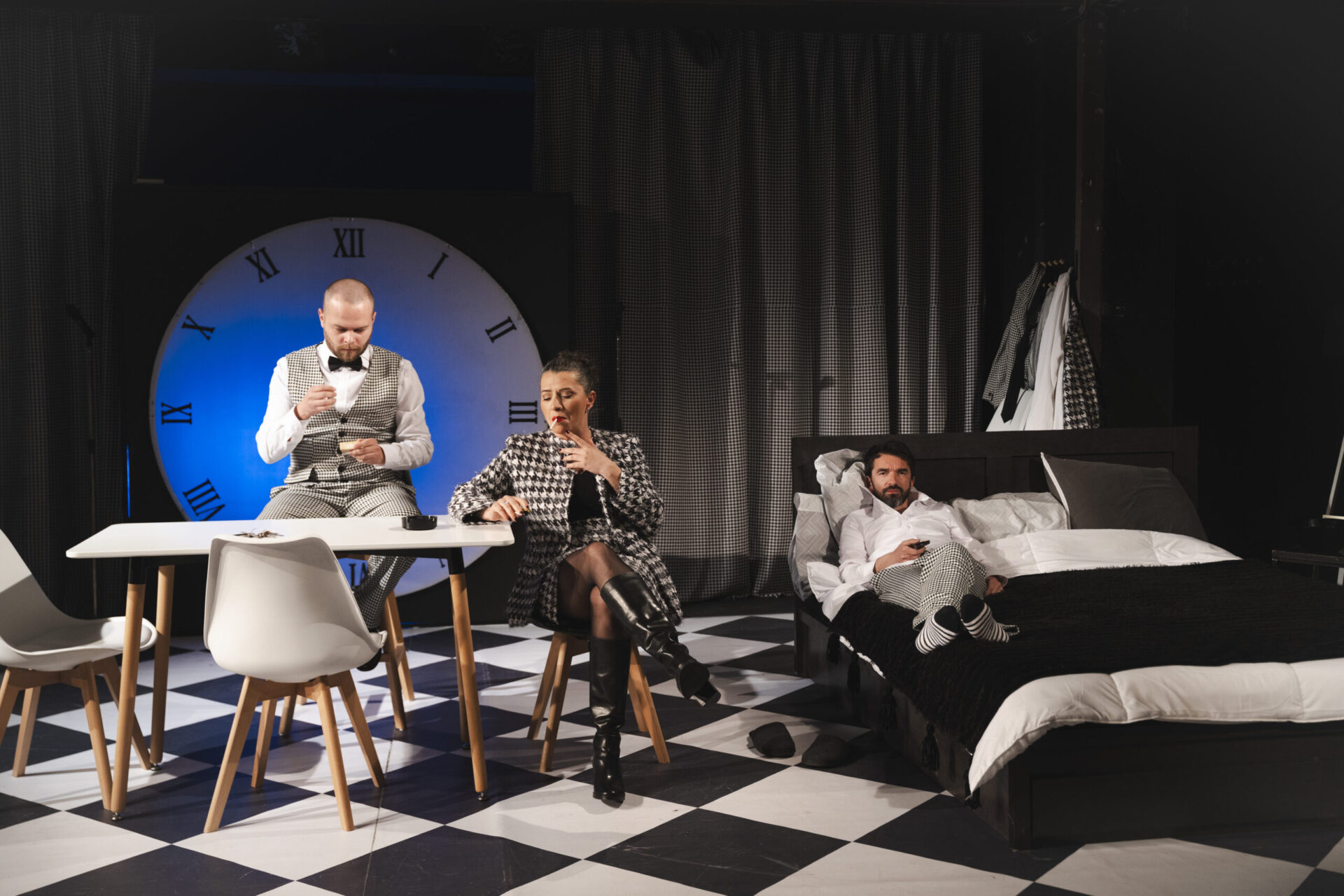 Сценографијата и костимите се на Благој Мицевски, додека за музиката беа задолжени Филип Јездиќ и Томе Темелкоски. Во претставата играа Филип Јездиќ како Саатот, Димитар Ѓорѓиовски (Јован) и Наташа Ачански (Вера) со вокалната придружба на Ана Митоска.