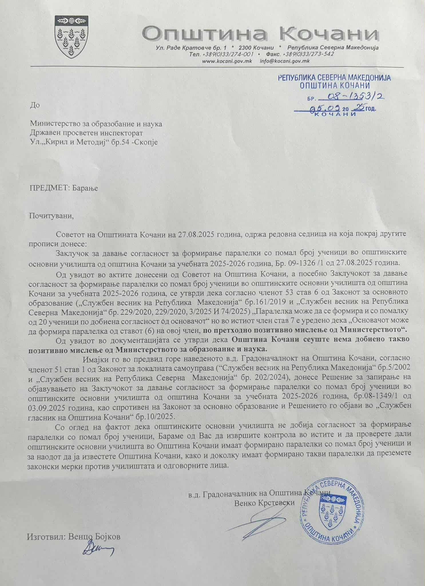 Општина Кочани нема добиено такво мислење. Секое друго формирање паралелки е нелегално и директно кршење на законот.