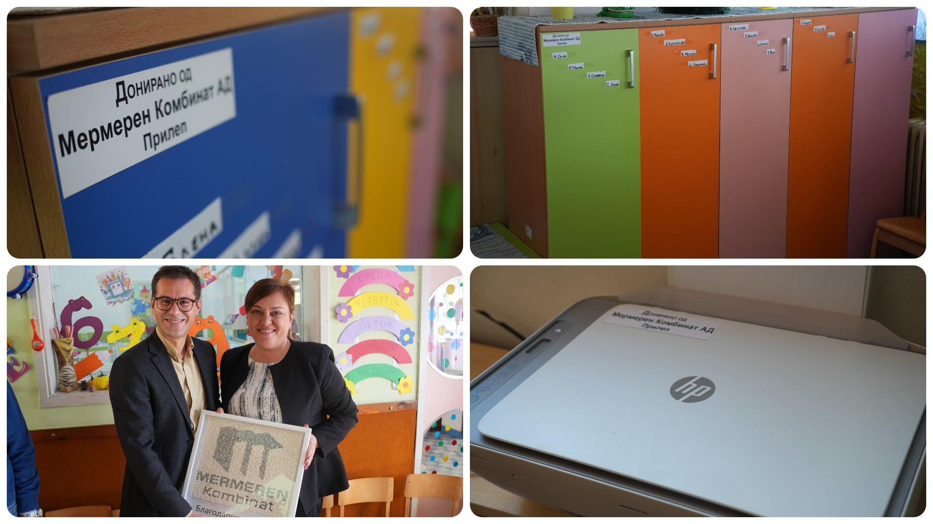 Мермерениот комбинат – Прилеп донираше опрема за детските градинки „Наша иднина“- Прилеп. Донацијата, во вредност од 20 илијади евра, вклучува шест клима-уреди, печатачи, машина за сушење, ламинатни подови и детски шкафчиња – опрема, кој е распределена во сите објекти од установата .