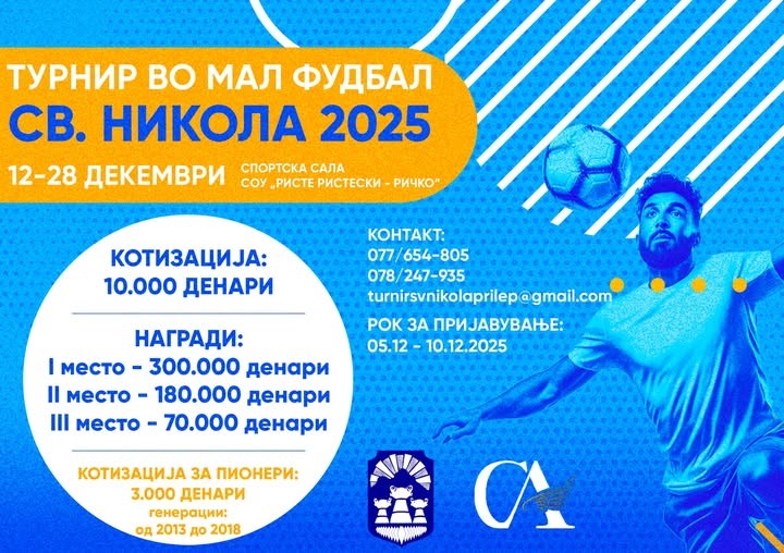 Турнирот ќе се одржи од од 12ми до 28ми декември во спортската сала на СОУ „Ристе Ристески Ричко, а пријавувањето на екипите започнува од денеска. И, оваа година покровител на турнирот во мал фудбал „Св.Никола 2025“ е Локалната Самоуправа на Општина Прилеп која дава максимална поддршка на спортот и команијата Комфи Ангел.